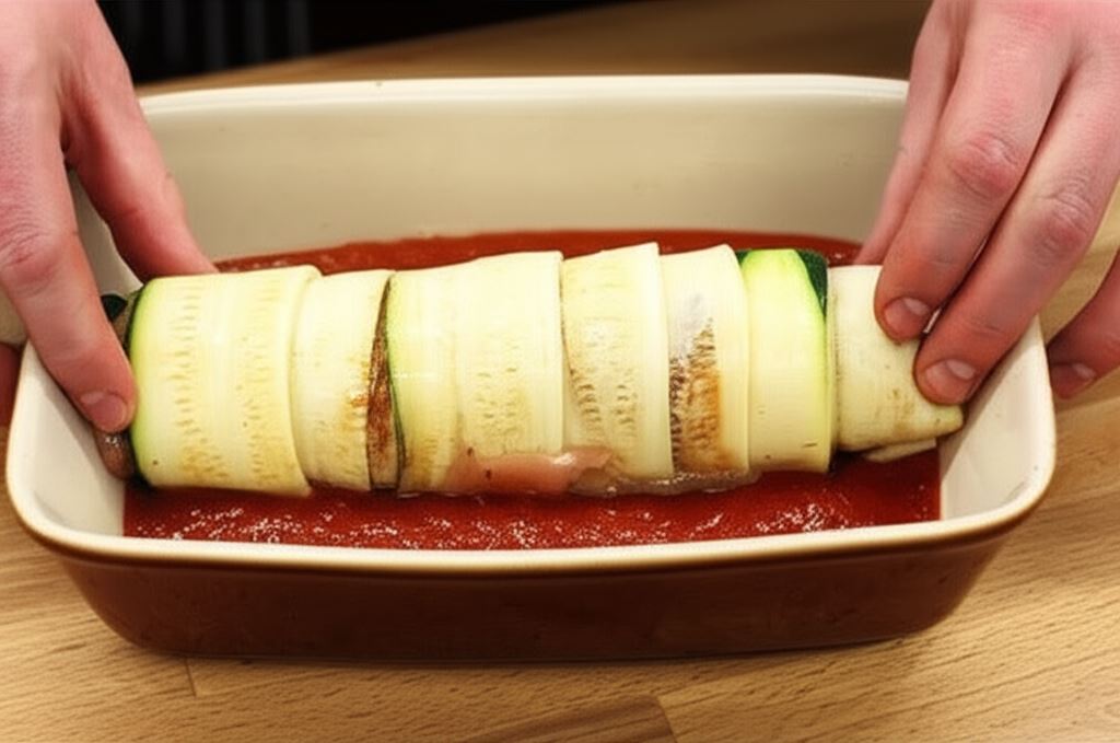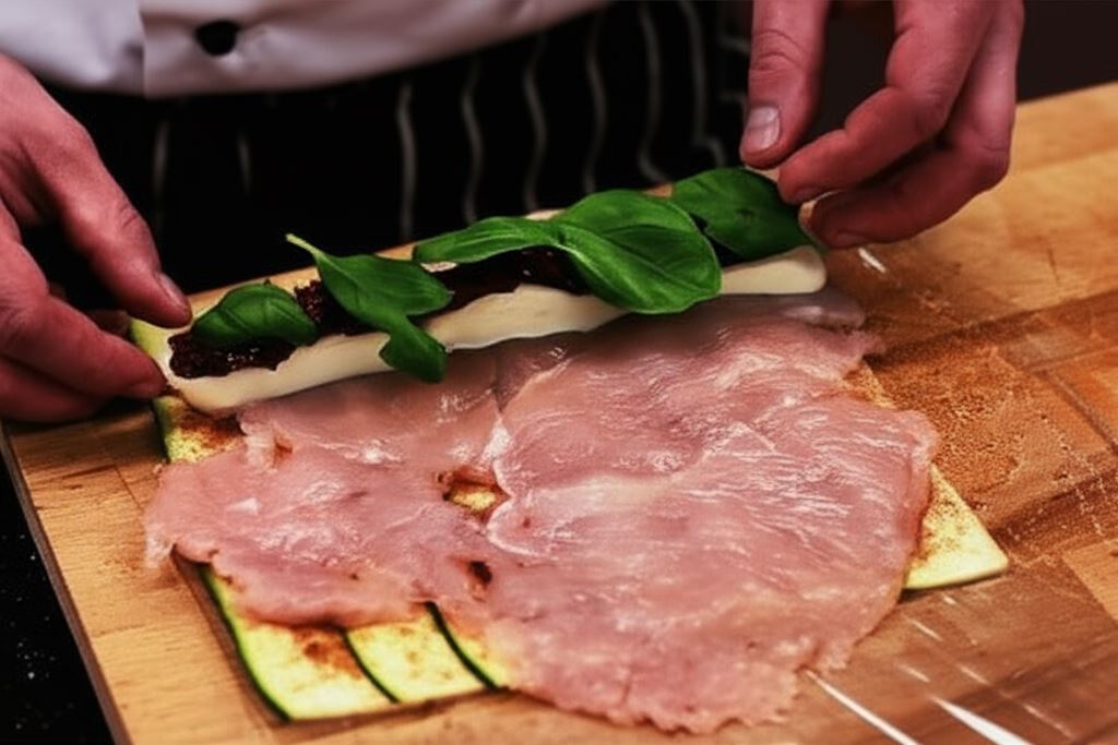 Odkryj śródziemnomorskie smaki zamknięte w soczystych roladkach z kurczaka! To eleganckie danie, które zachwyca nie tylko wyglądem, ale przede wszystkim harmonią smaków. Delikatne mięso drobiowe otulone cienkimi plastrami cukinii skrywa aromatyczny farsz z mozzarelli i suszonych pomidorów, a całość dopełnia esencjonalna pomidorowa salsa.