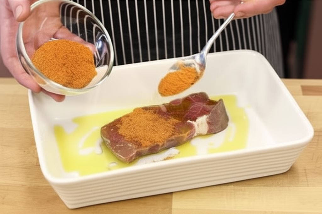 Rostbef posyp przyprawą do mięsa, wlej oliwę. Mięso obsmaż krótko na gorącej patelni z obu stron, potem umieść w rozgrzanym do 200 °C piekarniku na około 20 minut. Następnie mięso ostudź, pokrój na cienkie plasterki.