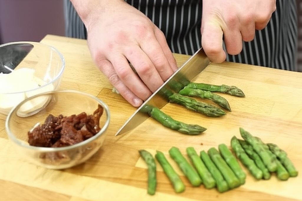 Szparagi oczyść z łodyżek, odetnij około 5 cm od końca. Ugotuj w wodzie z dodatkiem cukru i soli przez 2 – 3 minuty, następnie ostudź i potnij na kawałki długości ok. 8 cm. Ser mozzarella pokrój w plastry, po czym przekrój na połówki, suszone pomidory również przekrój na pół.