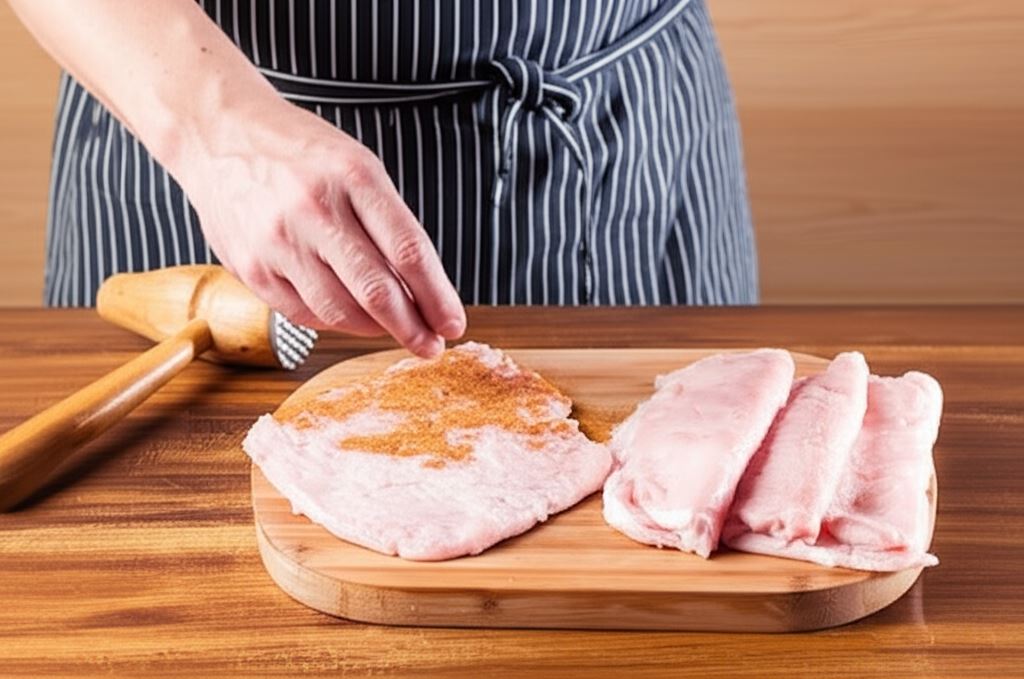 Schab potnij na plastry o grubości 2cm. Potem roztłucz tłuczkiem na cienkie plastry. Tak obrobione mięso posyp przyprawą Knorr.