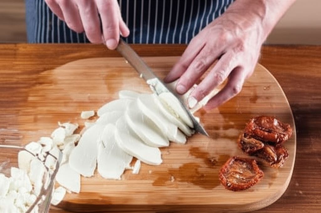 Mozarellę i suszone pomidory dokładnie posiekaj, by składniki się połączyły. Dodaj też przeciśnięty przez praskę czosnek.