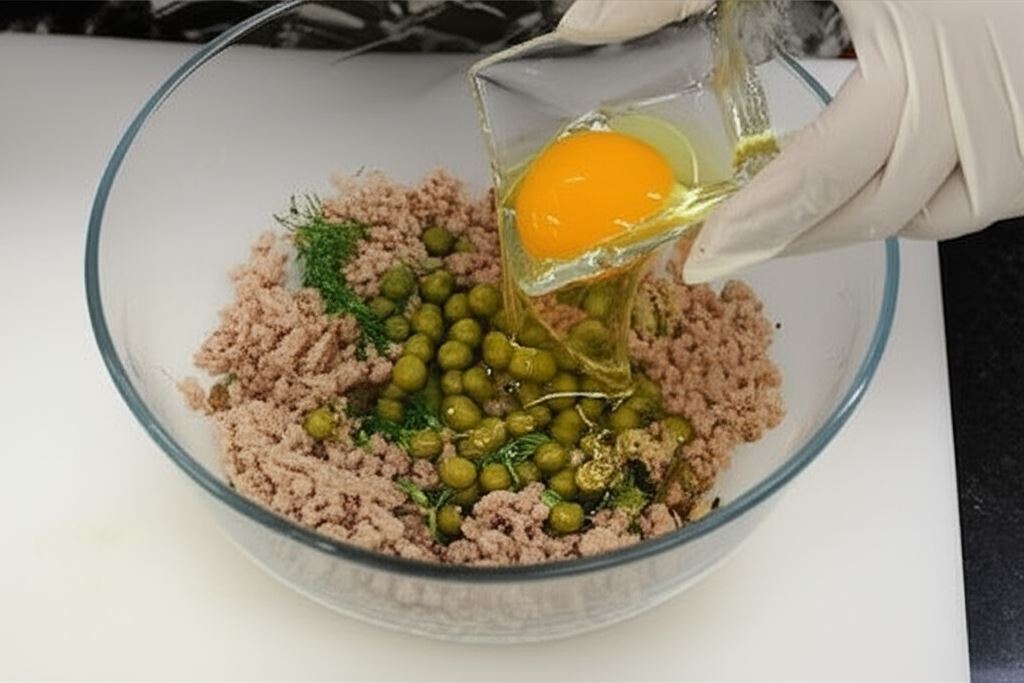 Wyjmij delikatne mięso i oddziel od kości, zmiel i wymieszaj z groszkiem oraz jajem.