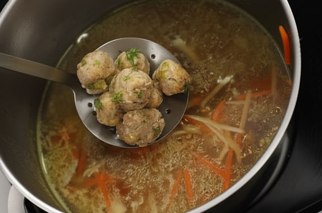 Przypraw według smaku i uformuj z masy niewielkie kulki, umieść je w rosole. Jeśli masa mięsna jest zbyt płynna, dodaj trochę bułki tartej. Gotuj przez 10 minut. Rosół z kury serwuj natychmiast po przygotowaniu.