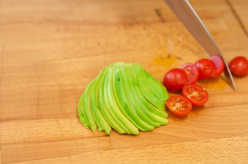 Obierz awokado i potnij w długie paski, pomidory przekrój na połówki.