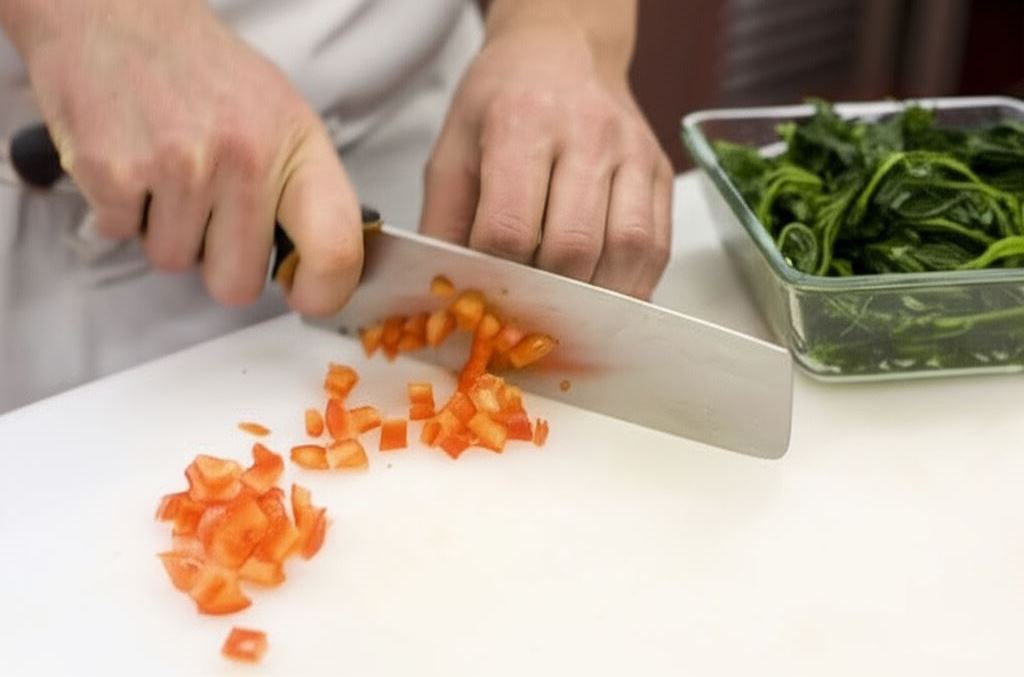 Paprykę pokrój w kosteczkę, szpinak odmroź i odcedź.