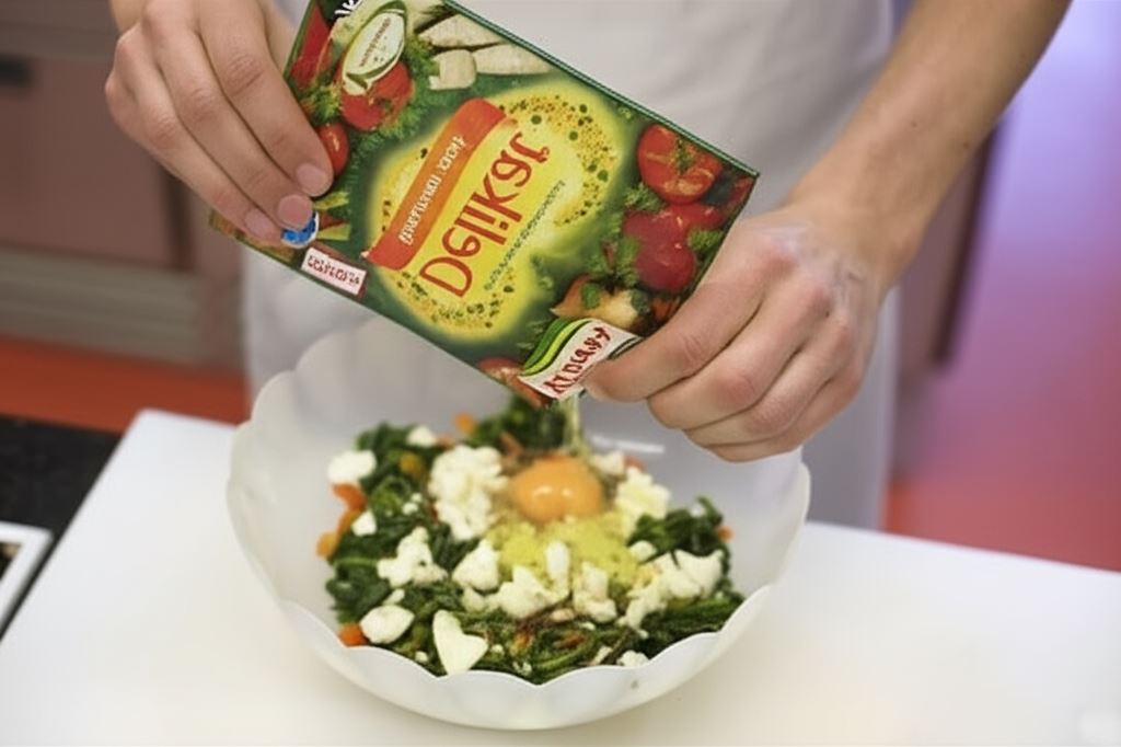 Do masy wsyp jajko, pokruszoną fetę, dopraw gałką muszkatołową oraz przyprawą Knorr.