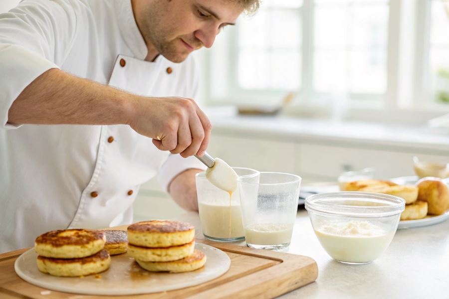 Formowanie syrników wymaga specjalnej techniki. Najlepiej robić to mokrymi dłońmi, co zapobiega przywieraniu ciasta. Uformowane placki warto delikatnie oprószyć mąką z obu stron przed umieszczeniem na patelni – utworzy się cienka skorupka, która pomoże zachować kształt.
