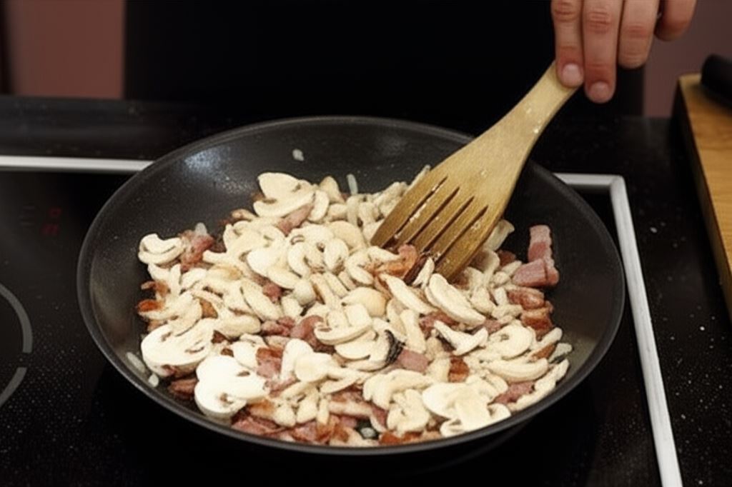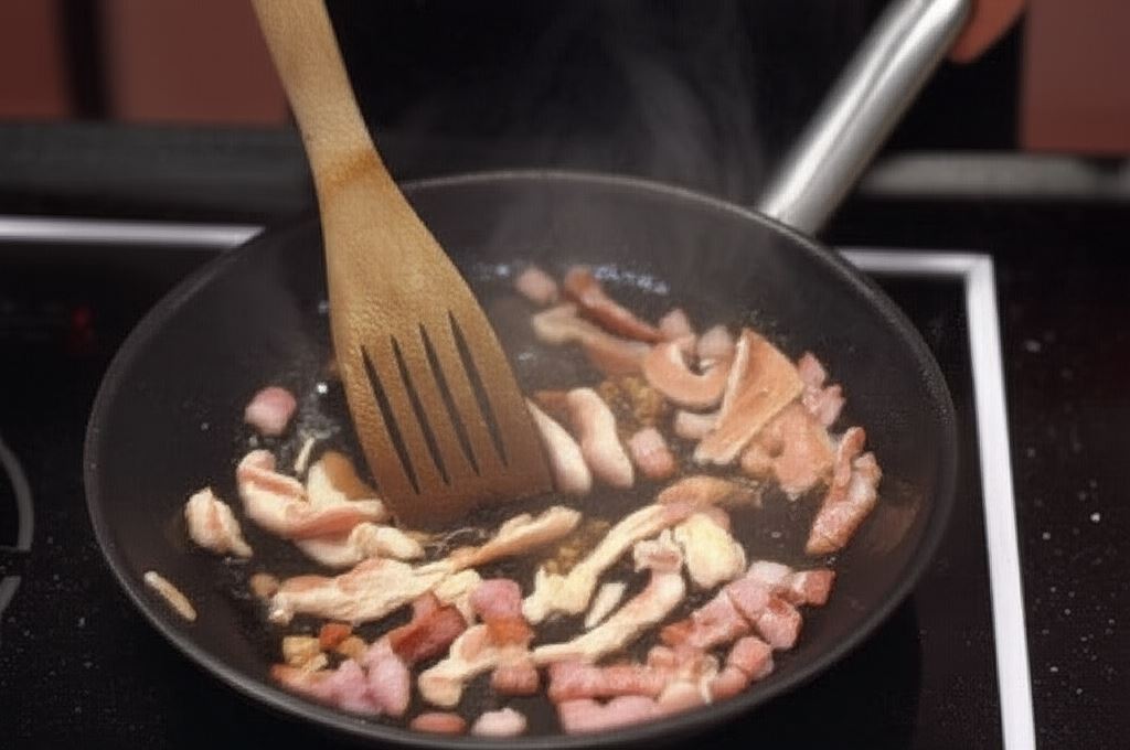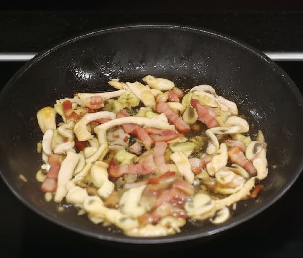 Rozgrzej olej na patelni i zrumień kawałki piersi kurczaka wraz z boczkiem pokrojonym w paski.