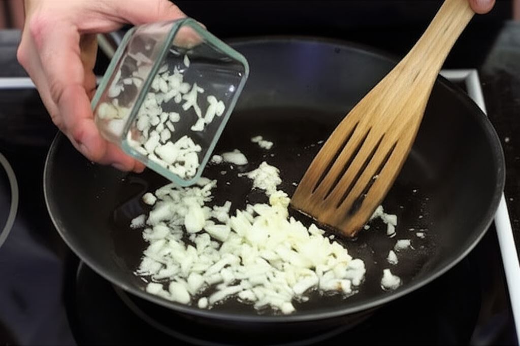 Rozgrzej na patelni olej z zalewy po odcedzonych suszonych pomidorach i zrumień na nim posiekany czosnek oraz cebulę.