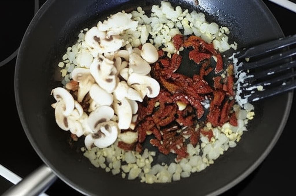 Suszone pomidory potnij w paski, a pieczarki w plastry. Wrzuć wszystko do cebuli i smaż, dopóki nie uzyska złotego koloru.