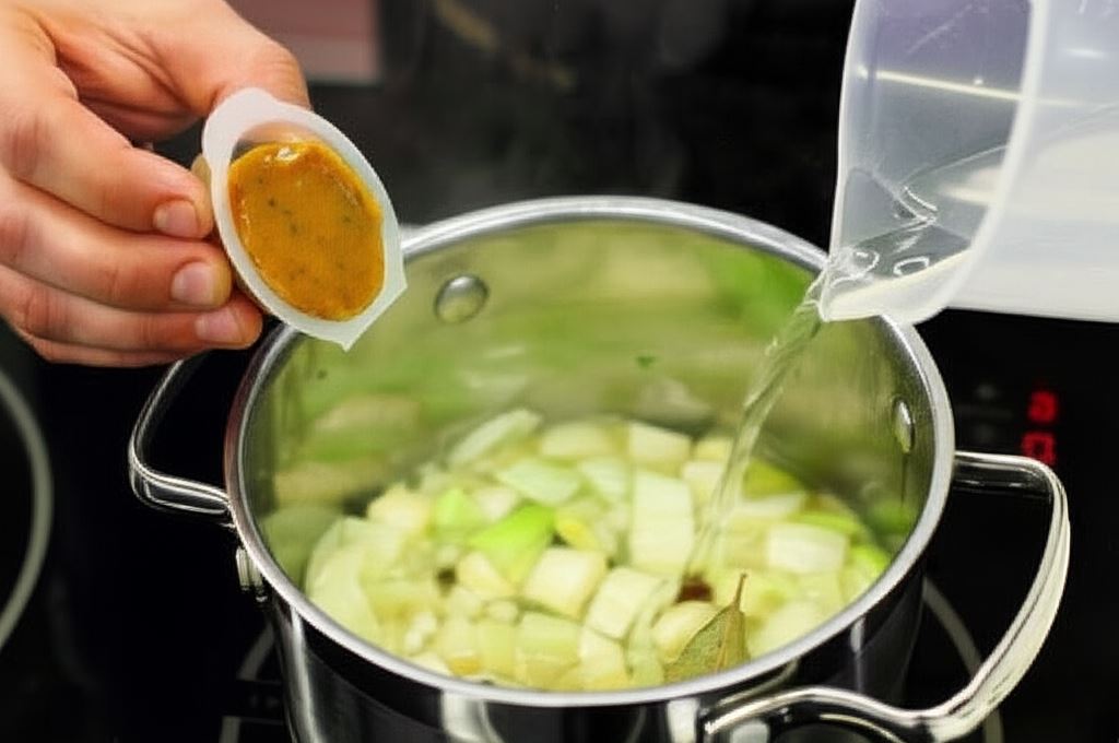 Fennel i pasternak potnij na drobniejsze części. Włóż do garnka, zalej wermutem, wsyp przyprawy (ziele angielskie, liść laurowy i pieprz) oraz Bulion na włoszczyźnie Knorr. Dolej 300 mililitrów wody i zagotuj. Gotuj wszystko przez około 5 minut.