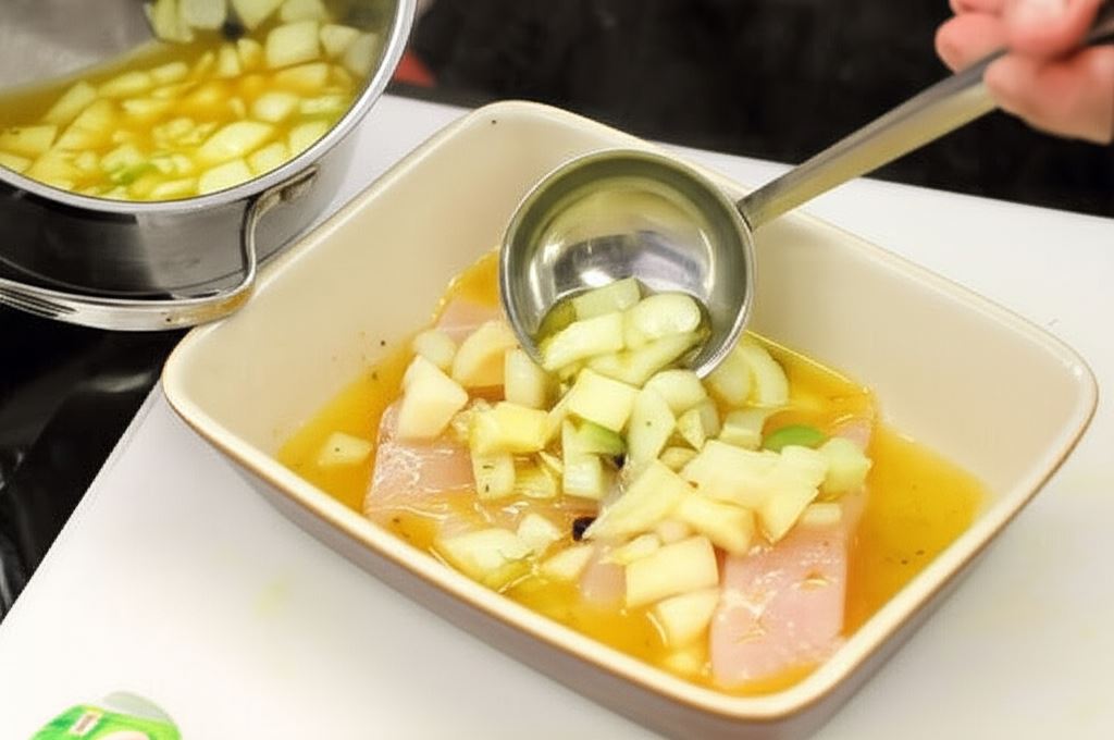 Rybę umieść w naczyniu żaroodpornym, po czym zalej bulionem ugotowanym razem z warzywami.