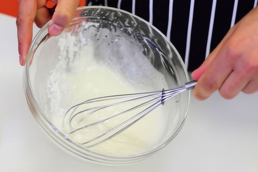 Ostrożnie ubij białka. Wsyp sól, dodaj wódkę, półtorej łyżki mąki, po czym wymieszaj. Uformuj jednolite, rzadkie ciasto.