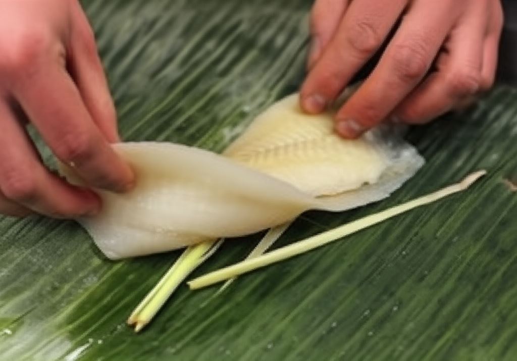 Na liściu bananowym umieść rozgniecioną łodygę trawy cytrynowej. Na górze ułóż cały filet rybny.