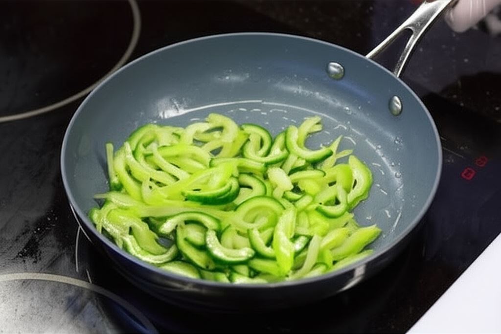 Przekrój ogórka na pół wzdłużnie, wydrąż nasiona łyżeczką i pokrój go, razem z selerem, na cienkie plasterki.