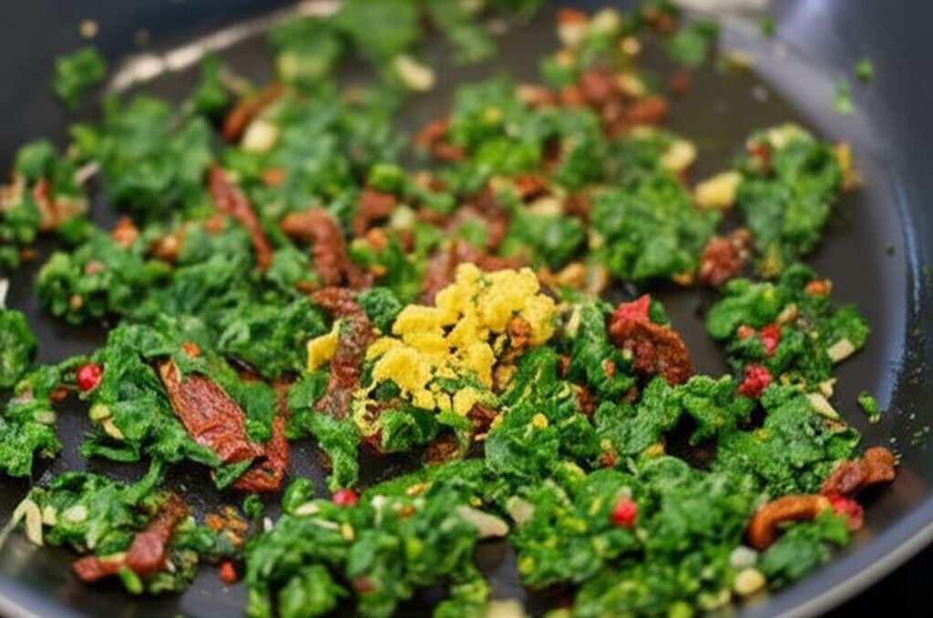Na rozgrzanej oliwie na patelni zrumień posiekaną w małą kosteczkę cebulę, czosnek i chilli. Kiedy cebula się zeszkli wsyp rozmrożony, odciśnięty z soku szpinak.