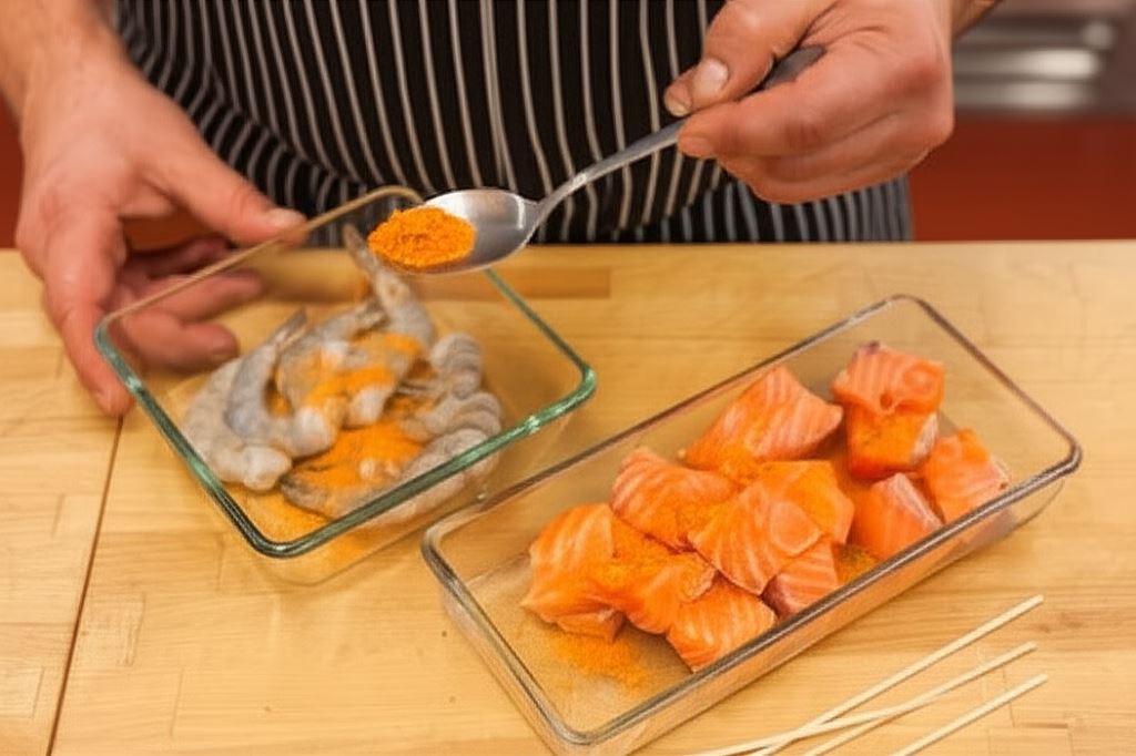 Rybę potnij w kostkę 2x2 cm. Pociętą rybę i krewetki posyp przyprawą Knorr. Rybę i krewetki nadziewa na przemian z pomidorami na drewniane patyczki do szaszłyków.