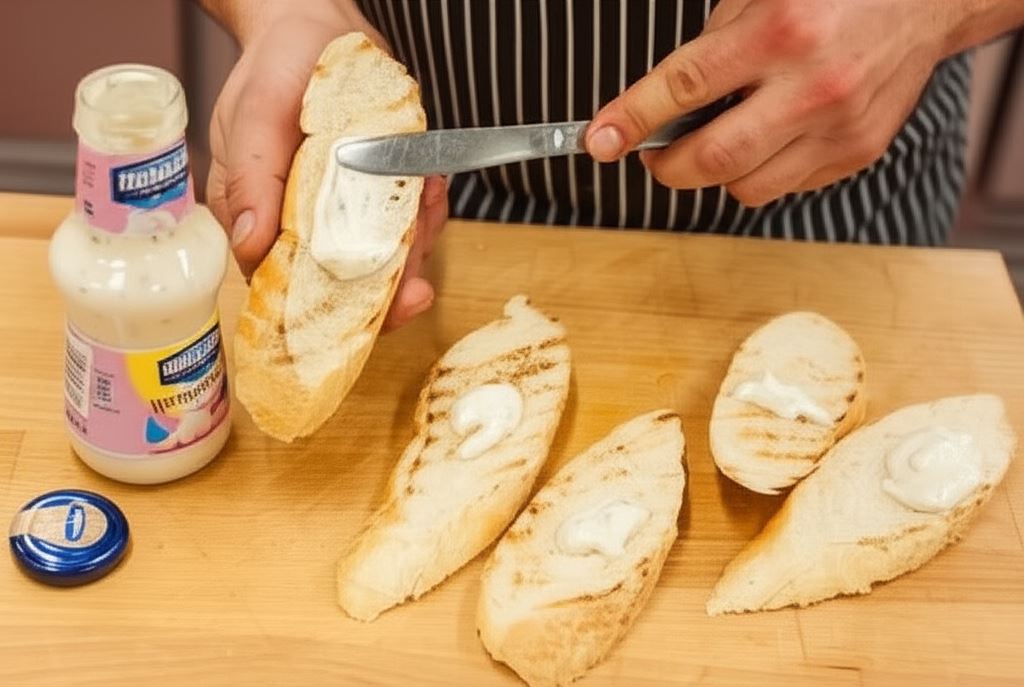 Bagietkę przekrój ukośnie na podłużne kromki i podpiecz na grillu. Potem posmaruj każdą z nich sosem czosnkowym Hellmann's.