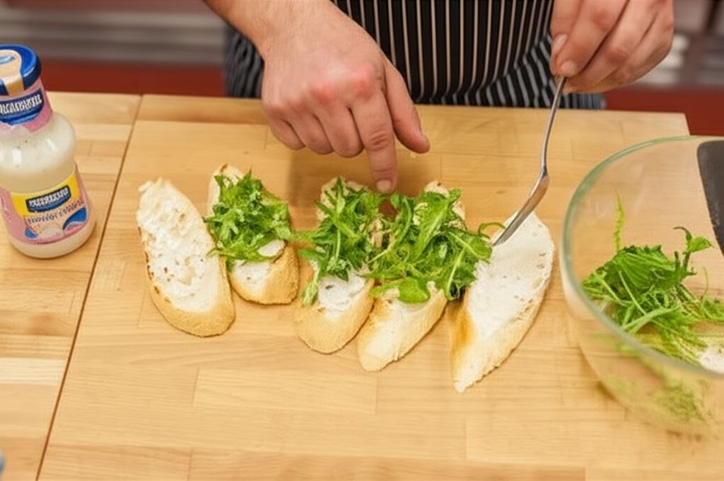 Przygotowane posmaruj sosem czosnkowym Hellmann's, roszponkę skrop oliwą z suszonych pomidorów (2 łyżki), zamieszaj i ułóż na każdej grzance.