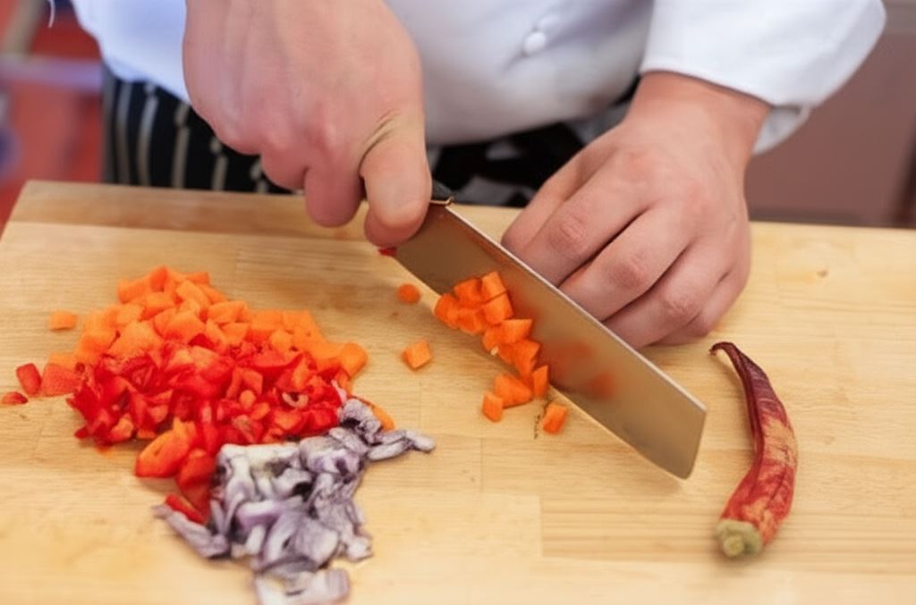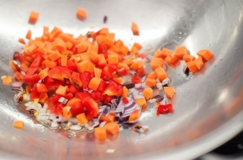 Cebulę, paprykę oraz marchew pokrój w małą kostkę, a papryczkę chili drobno posiekaj.