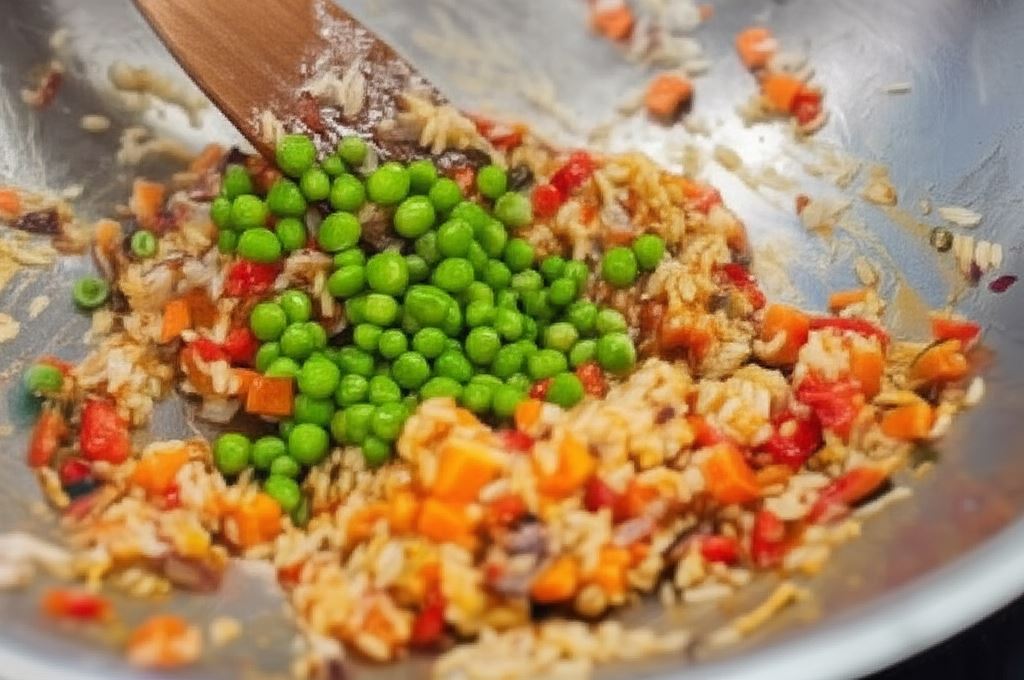 Dorzuć groszek i wszystko smaż jeszcze minutę, dopóki ryż nie wchłonie całego sosu. Serwuj od razu po przyrządzeniu jako oddzielne danie. By wzbogacić smak potrawy, możesz zastosować sos sojowy i na przykład kiełki oraz świeżą kolendrę.