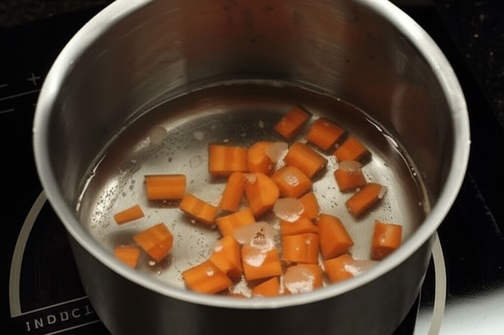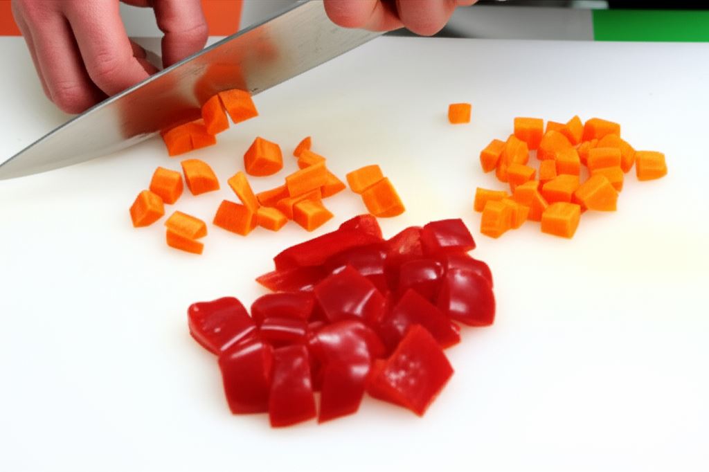 Pokrój marchewkę i paprykę w kostkę centymetrową. Ugotuj marchewkę.