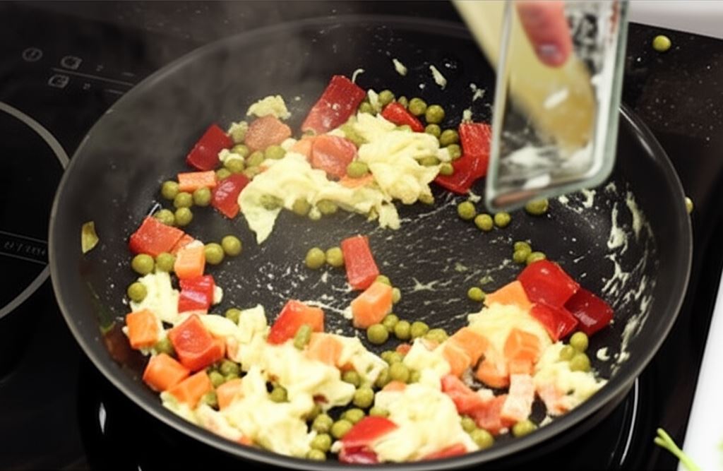 Podgrzej olej na patelni lub woku. Wymieszaj jajka i wlej na patelnię. Potem dodaj pocięte warzywa, groszek i ryż, intensywnie wszystko mieszając.
