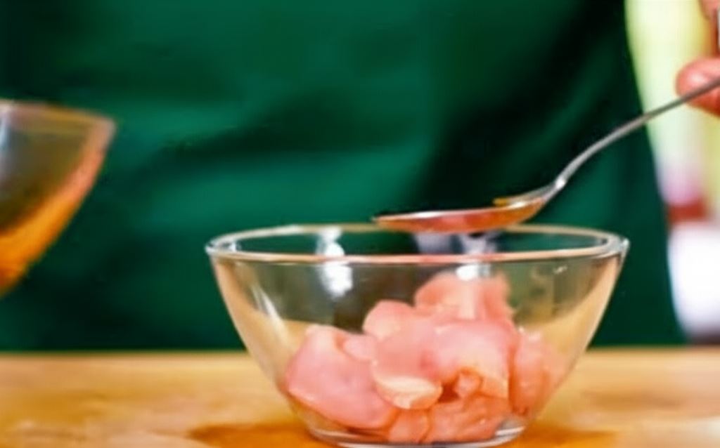 Potnij mięso na paski i polej je sosem sojowym.