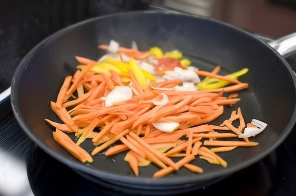 Doprowadź wodę do wrzenia w garnku, dodaj do niej ryż i ugotuj zgodnie z instrukcją na opakowaniu. Następnie odcedź i odstaw na bok. W trakcie gotowania ryżu możesz przygotować warzywa – paprykę, papryczkę chili, trzy marchewki i cebulę dymkę. Pokrój je w paski. Na patelni rozgrzej olej, po czym dodaj pokrojone warzywa. Smaż przez 10 minut.