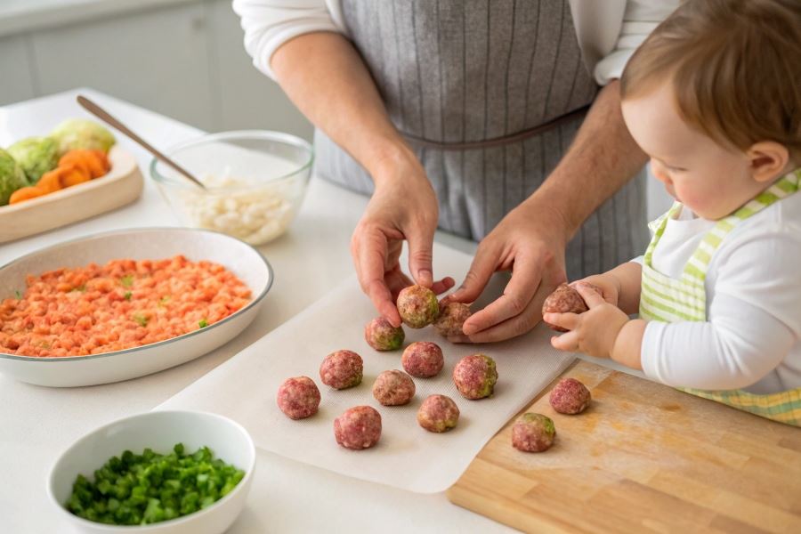 Mięso i warzywa należy dokładnie zmiksować na gładką masę. Formować małe kulki wielkości czereśni i gotować na parze przez 8-10 minut. Takie klopsiki dostarczają niezbędnego białka i żelaza, jednocześnie będąc łatwymi do uchwycenia przez małe rączki podczas nauki samodzielnego jedzenia.