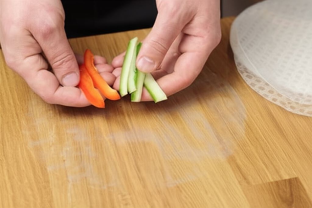 Arkusze papieru ryżowego zanurz na moment w zimnej wodzie, by stały się giętkie. Potem na zmoczony papier wyłóż pocięte warzywa.