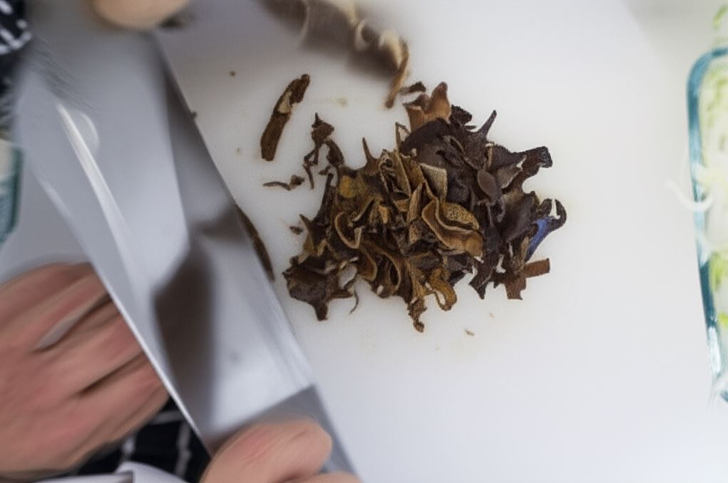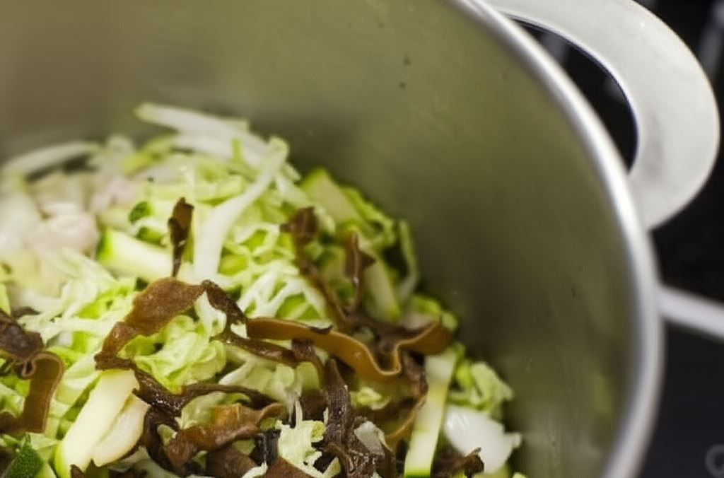Grzyby zamocz w gorącej wodzie przez około 30 minut, po czym odciśnij i potnij na paseczki. Kurczaka potnij w kosteczkę, cukinię na słupki, cebulę posiekaj, kapustę poszatkuj, a czosnek rozgnieć.
