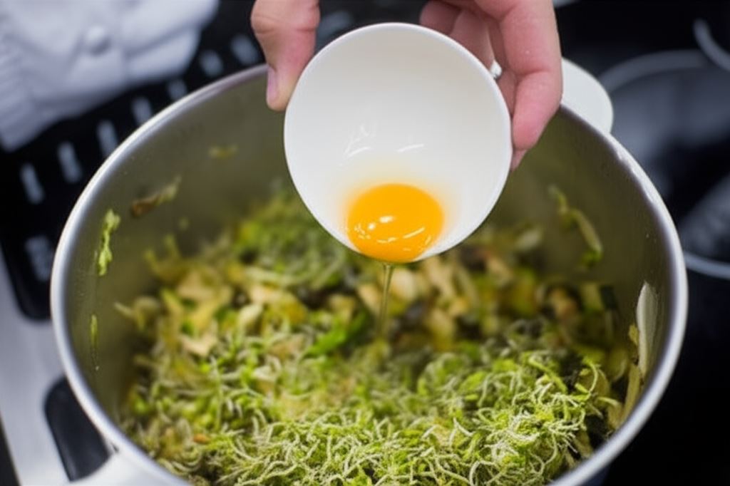 Gotuj, aż całość zmięknie, po czym dodaj kiełki i wbij jajko. Starannie wymieszaj i przysmaż. Odstaw nadzienie do wystygnięcia. Powinno być zwarte.