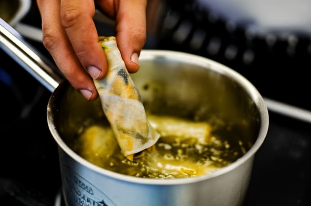 Sajgonki wkładaj na głęboki, gorący olej i smaż do złotego koloru. Serwuj z sosem słodko-kwaśnym i ryżem.