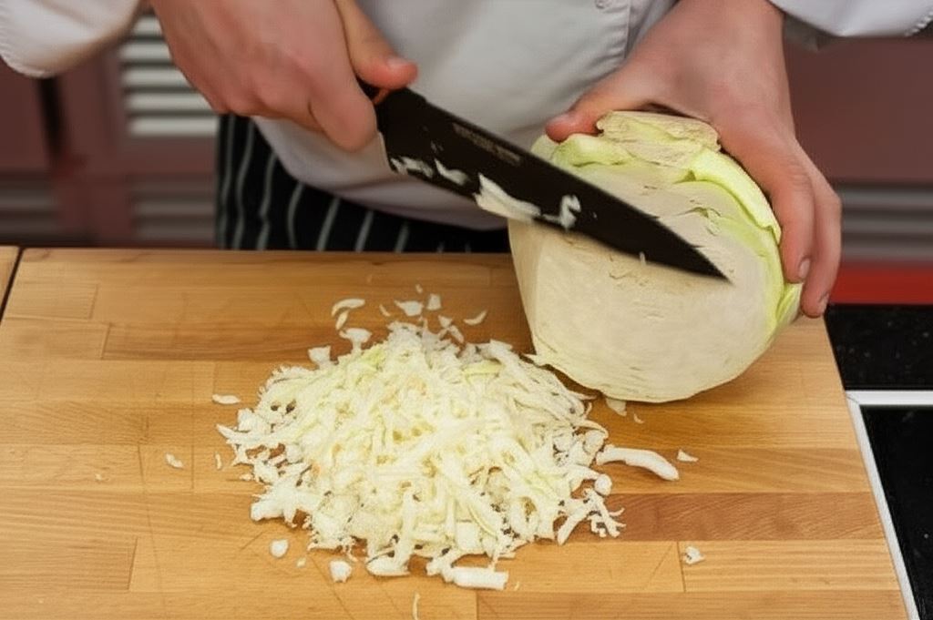 Kapustę poszatkuj cienko. Dodaj szczyptę soli i pozostaw na 10 minut.