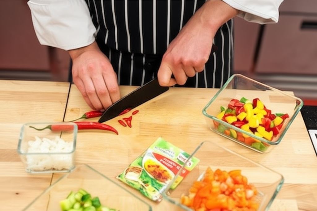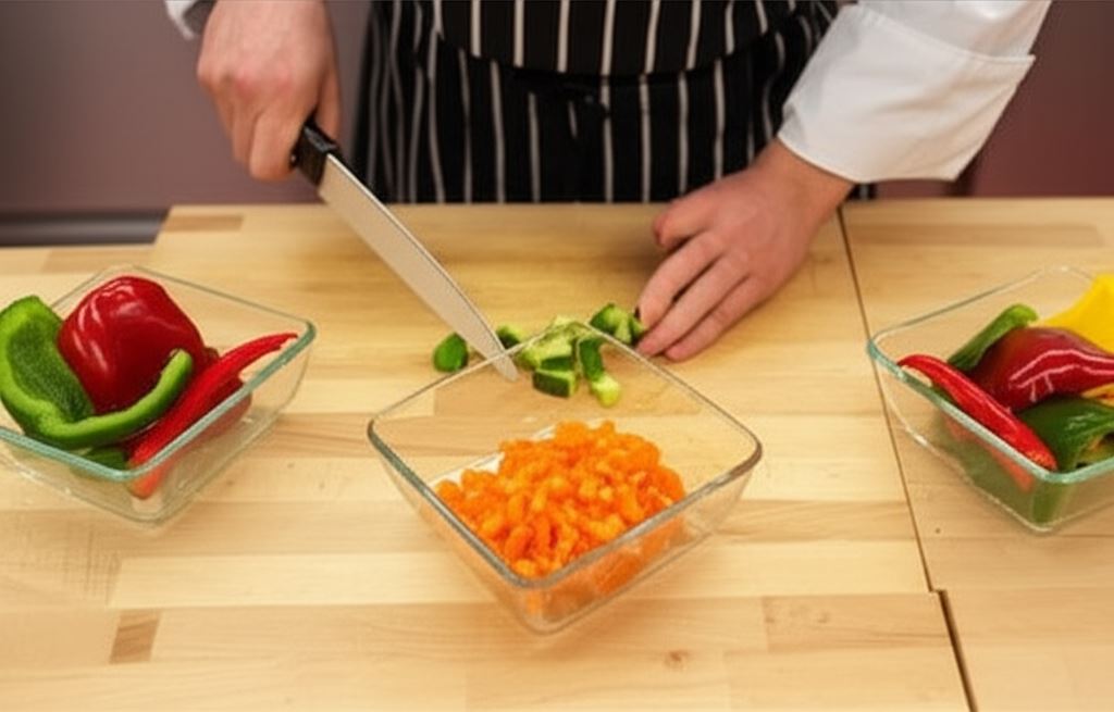 Papryki pozbawione gniazd nasiennych pokrój w kostkę. Ostre papryczki pokrój na cienkie plasterki. Cebulę drobno posiekaj.