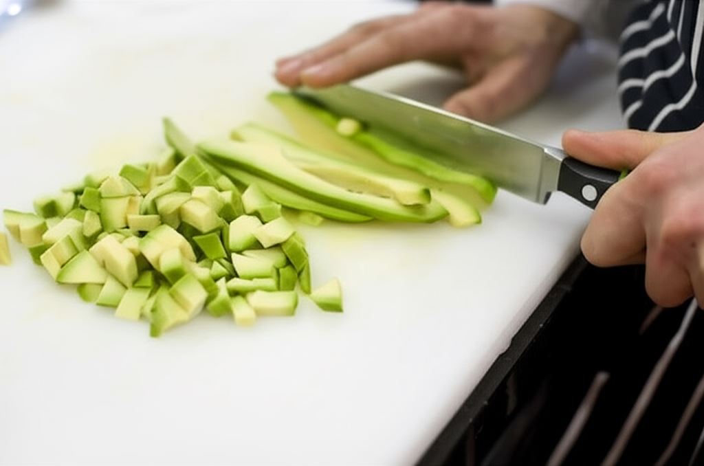 Obierz awokado ze skórki, wyjmij pestkę, a miąższ pokrój w kostkę.