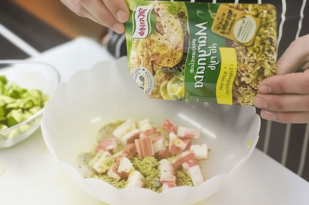 Krewetki oczyść, zdejmij skorupki. Wraz z paluszkami krabowymi potnij na mniejsze kawałki i przypraw przyprawą Knorr.