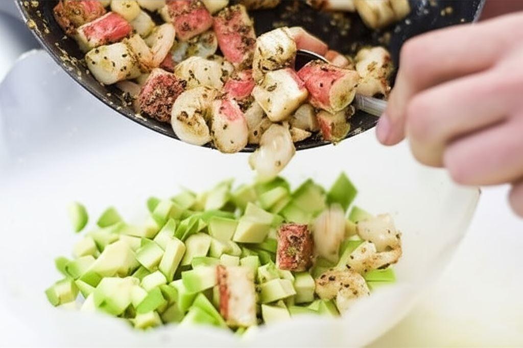 Podsmażaj krewetki i paluszki na oleju przez 5-6 minut. Potem wraz z olejem wrzuć do awokado.