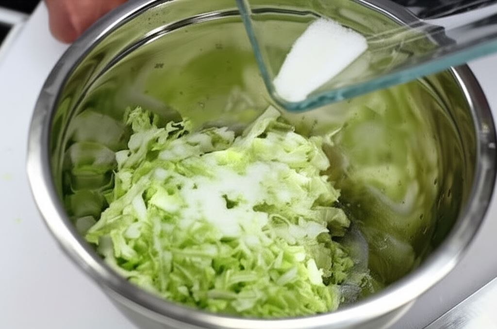Kapustę drobno poszatkuj. Dodaj szczyptę soli i cukru. Wymieszaj i pozostaw na 10 minut.
