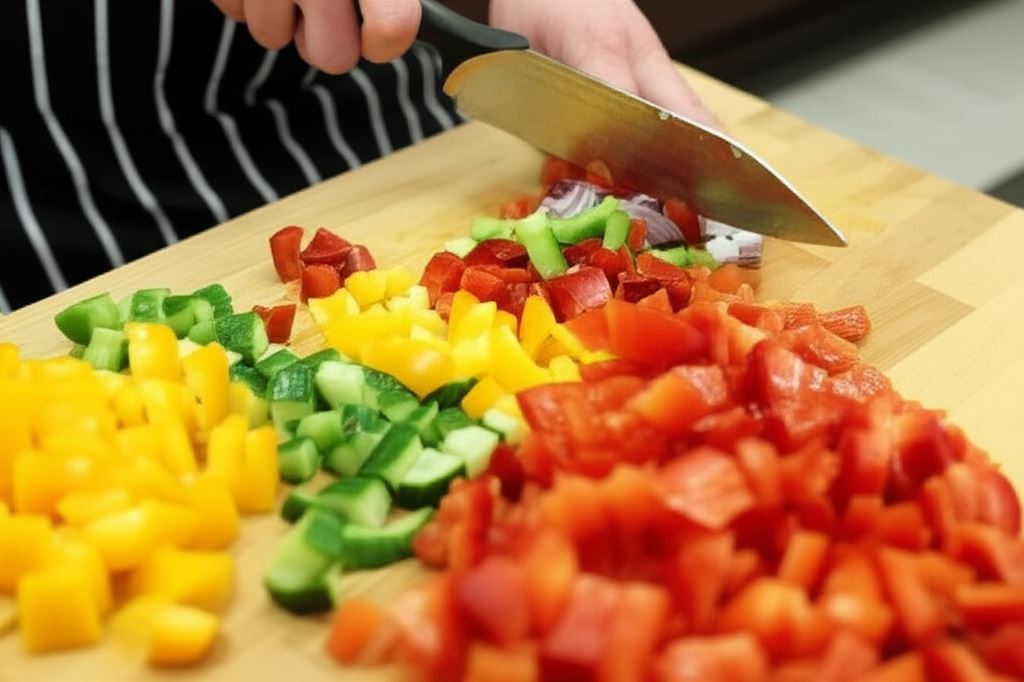 Dokładnie umyj wszystkie warzywa i pokrój je w kostkę o wymiarach 1 cm.