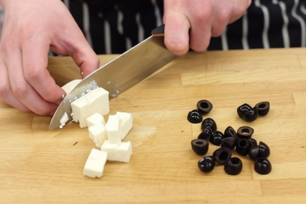 Przekrój oliwki na połówki. Ser feta pokrój również w kostkę.