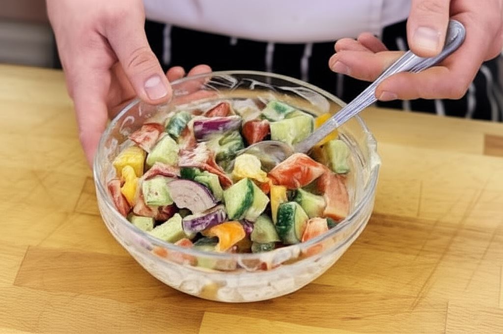 Wymieszaj warzywa z sosem i umieść sałatkę w salaterce.