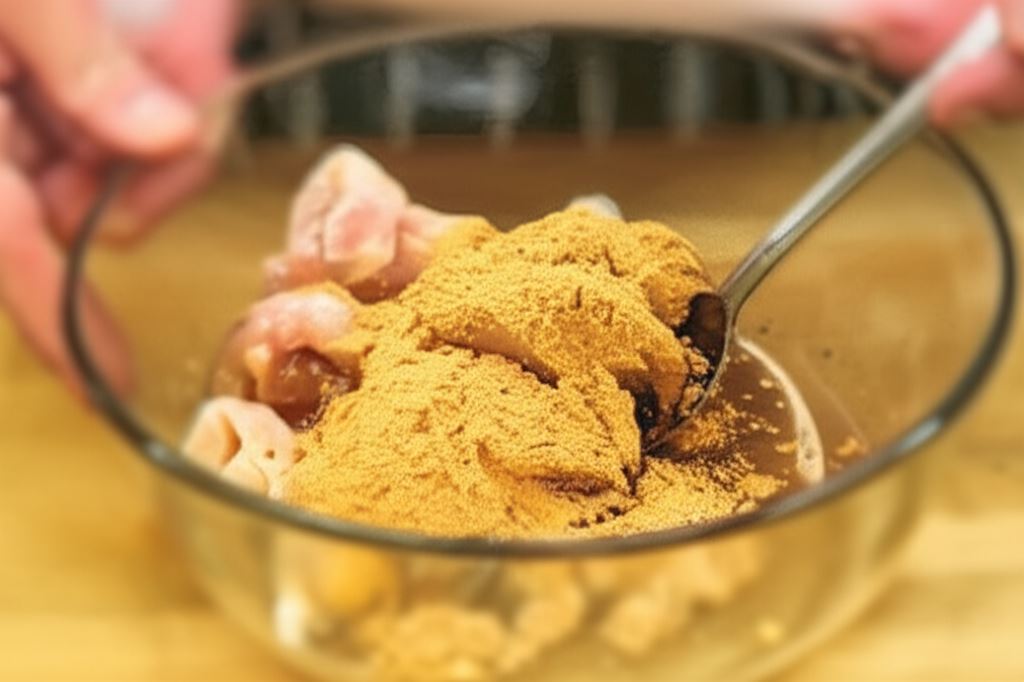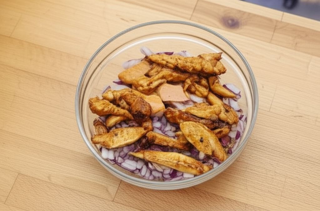 Mięso potnij w paski i obsyp Fixem Knorr. Zrumień na patelni i odłóż do wystygnięcia. Sporządź sos, łącząc Ketchup Hellmann's Pikantny z Majonezem Babuni Hellmann's i sosem czosnkowym z opakowania Fix Knorr.