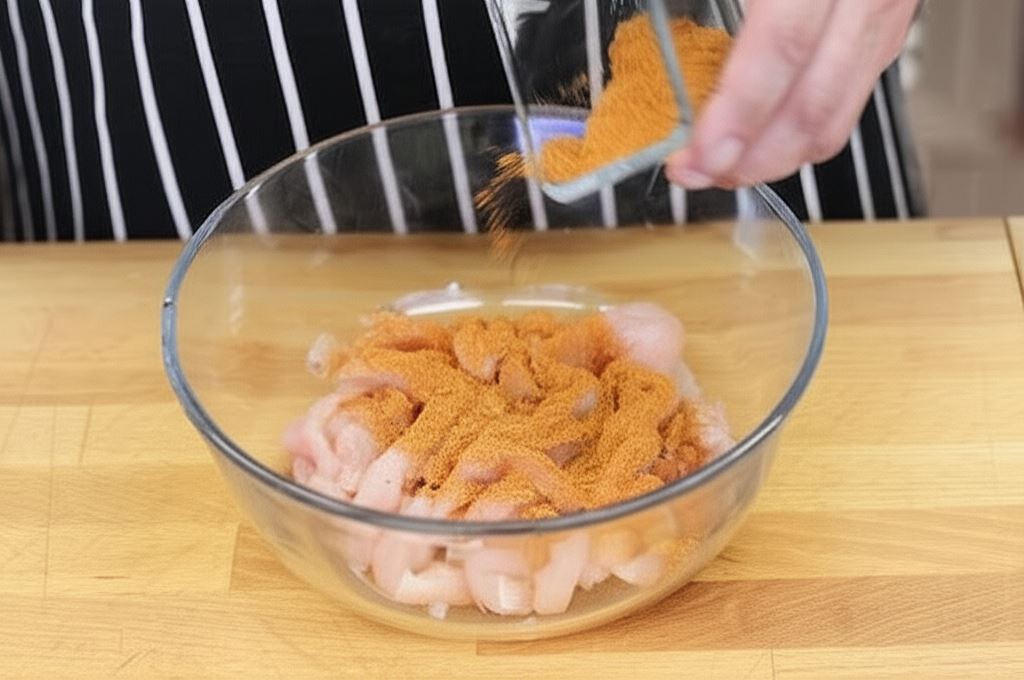Podziel pierś kurczaka na paski i posyp przyprawą Knorr.