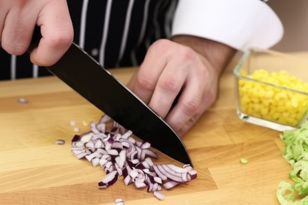 Poszatkuj kapustę pekińską, a kukurydzę odcedź z zalewy. Cebulę pokrój w drobną kostkę.