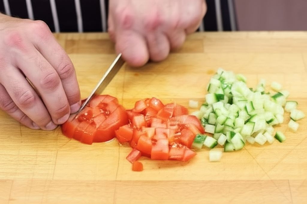 Pomidory i ogórki opłucz i pokrój w kosteczkę.