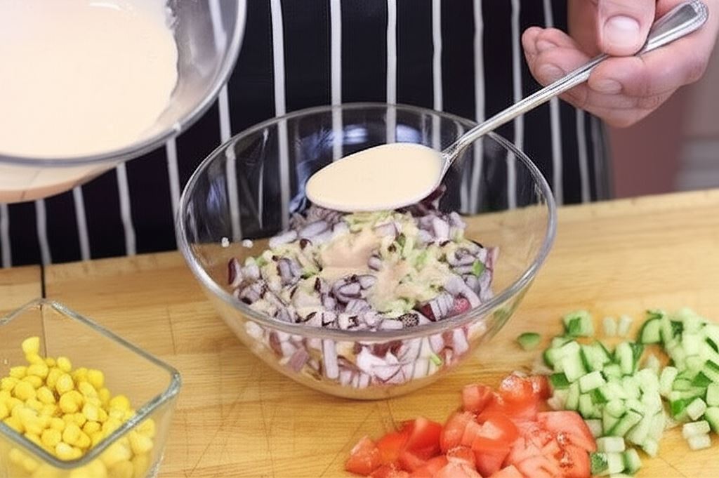W miseczce formuj sałatkę układając warstwy z komponentów. Każdą warstwę skrop sosem.