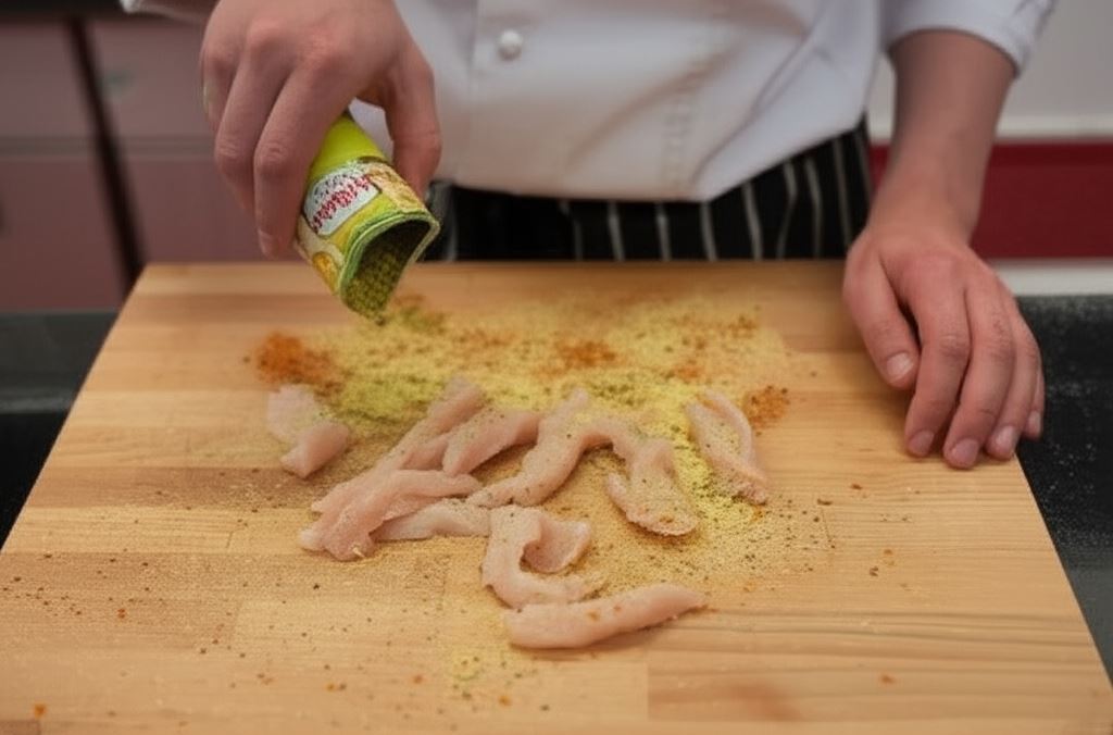Kurczęcą pierś opłucz, wysusz i potnij w paski. Potem oprósz przyprawą Delikat Knorr.