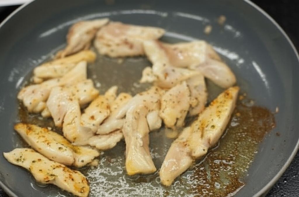 Przysmaż kurczaka na rozgrzanym oleju na patelni.